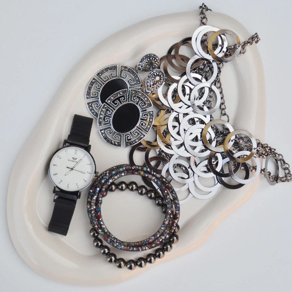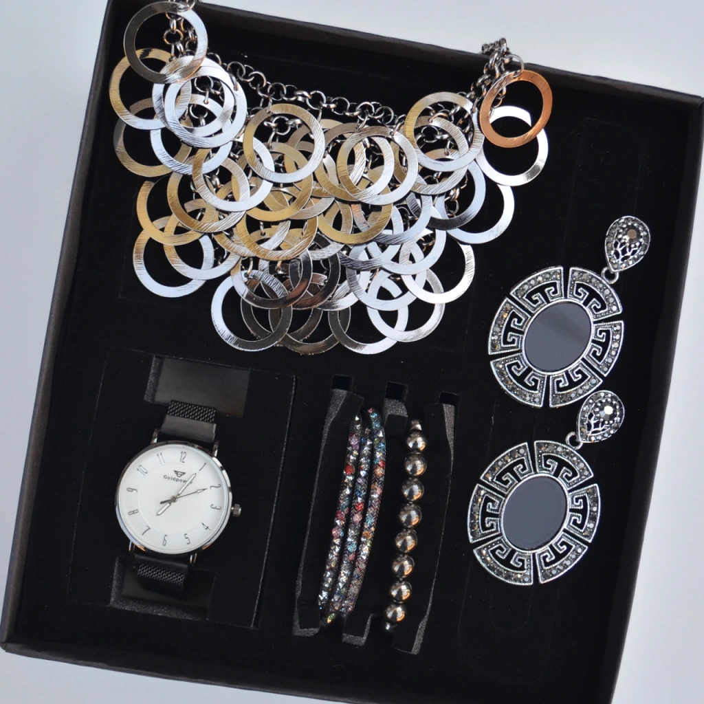 Saat, 2 adet bileklik, kolye, ve küpe olmak üzere set olarak gönderilmektedir.