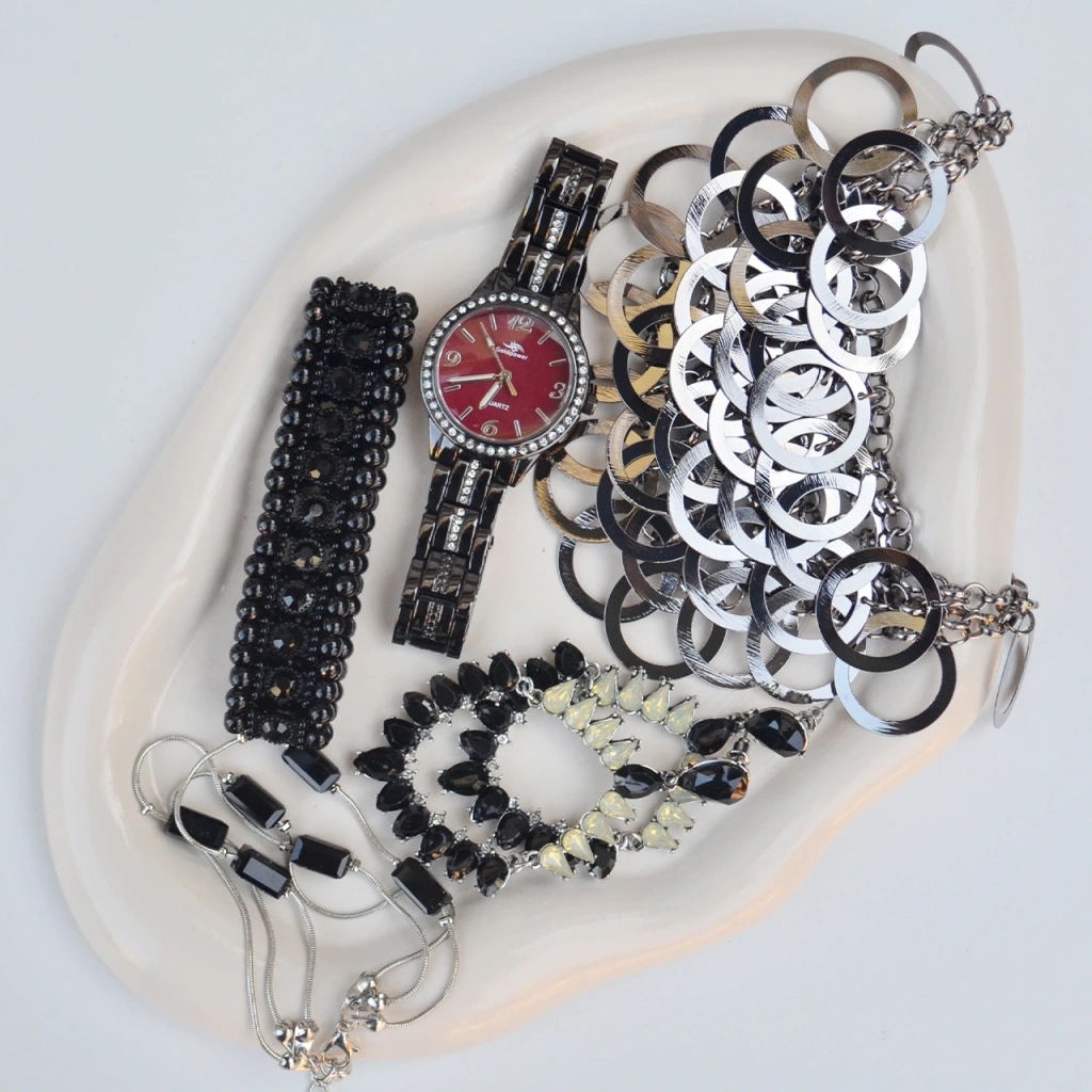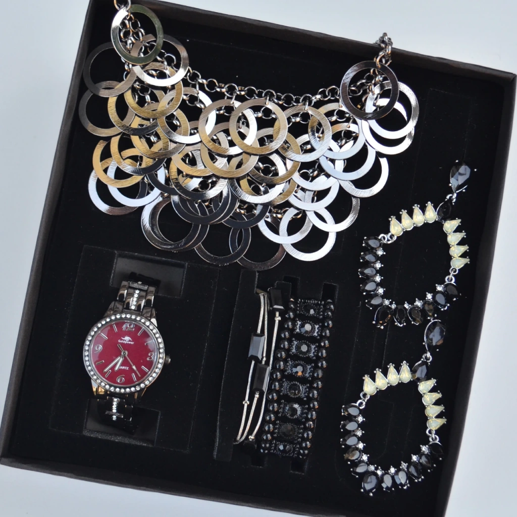 Saat, 2 adet bileklik, kolye, ve küpe olmak üzere set olarak gönderilmektedir.