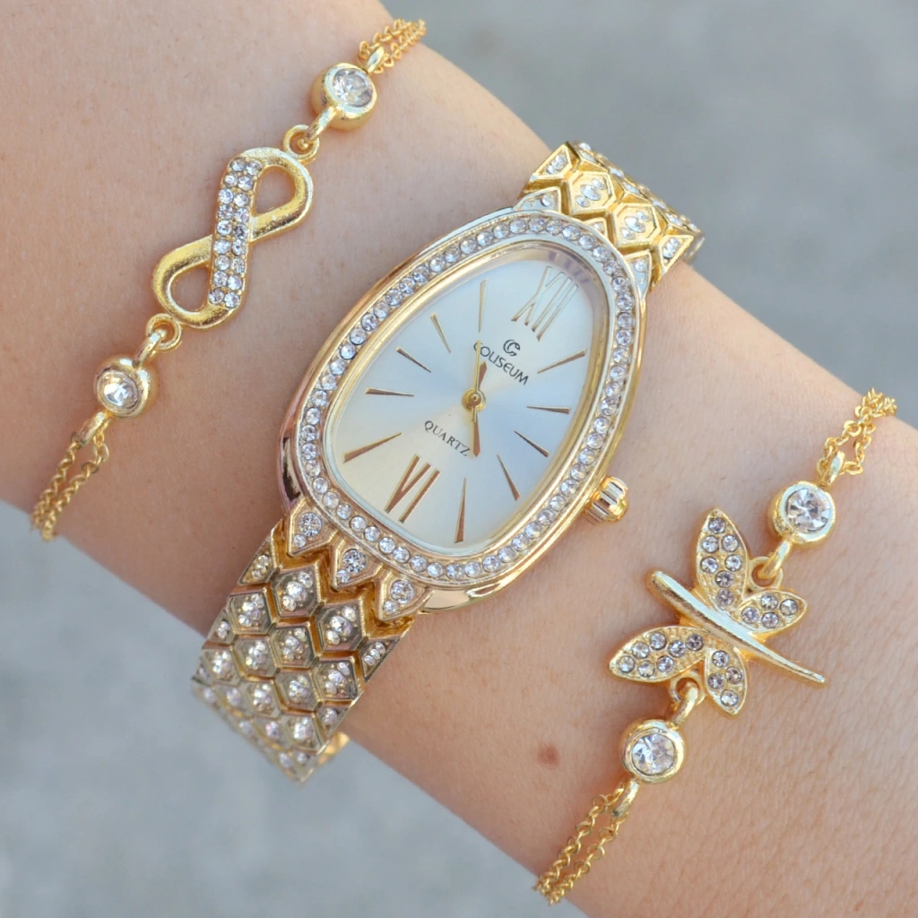 Gold Metal Kordon Kadın Saat Kombini 3582
