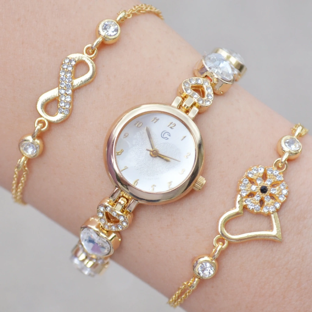 Gold Taşlı Metal Kordon Kadın Saat Kombini 3606