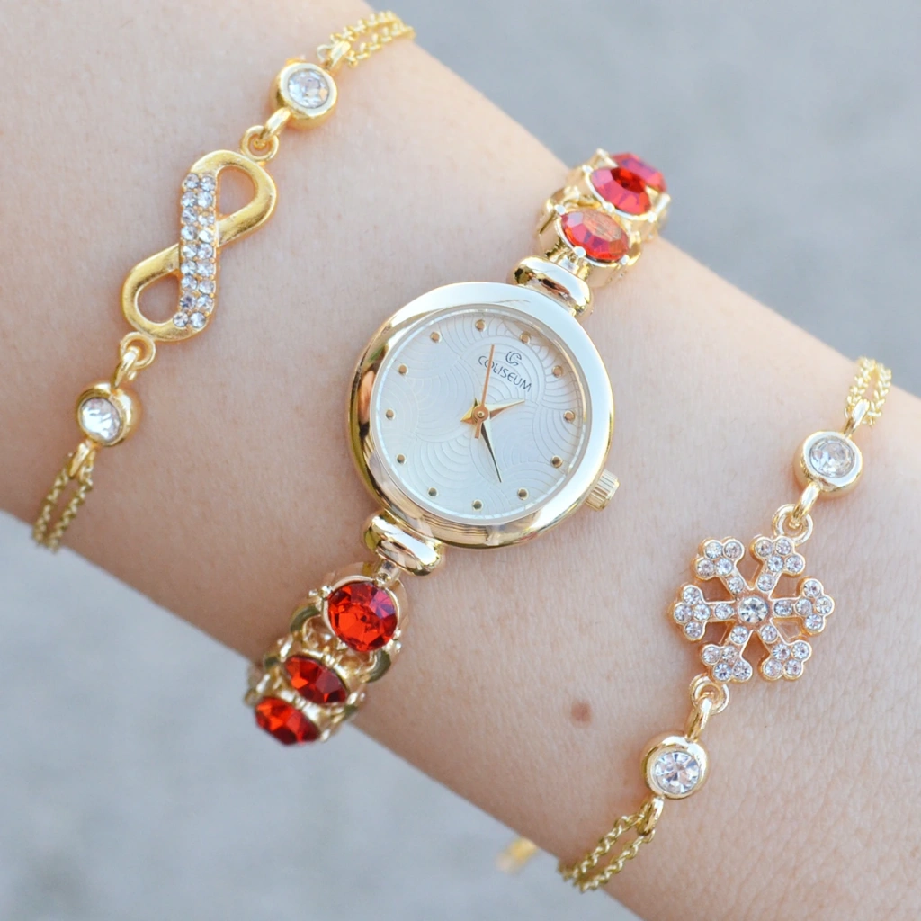 Kırmızı Taşlı Gold Metal Kordon Kadın Saat Kombini