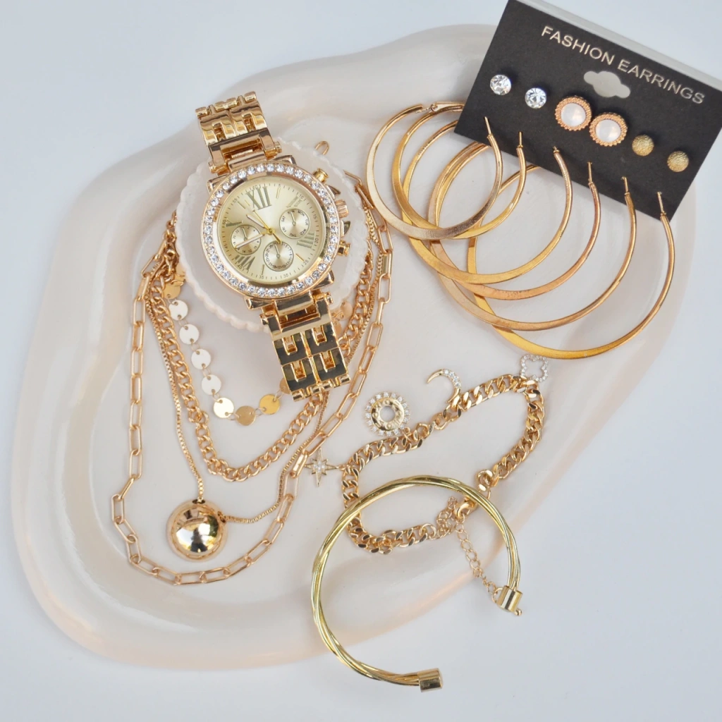 Saat, 2 adet bileklik, kolye, ve küpe olmak üzere set olarak gönderilmektedir.