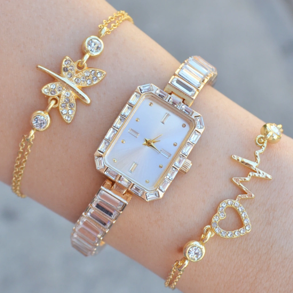 Gold Taşlı Metal Kordon Kadın Saat Kombini 3589