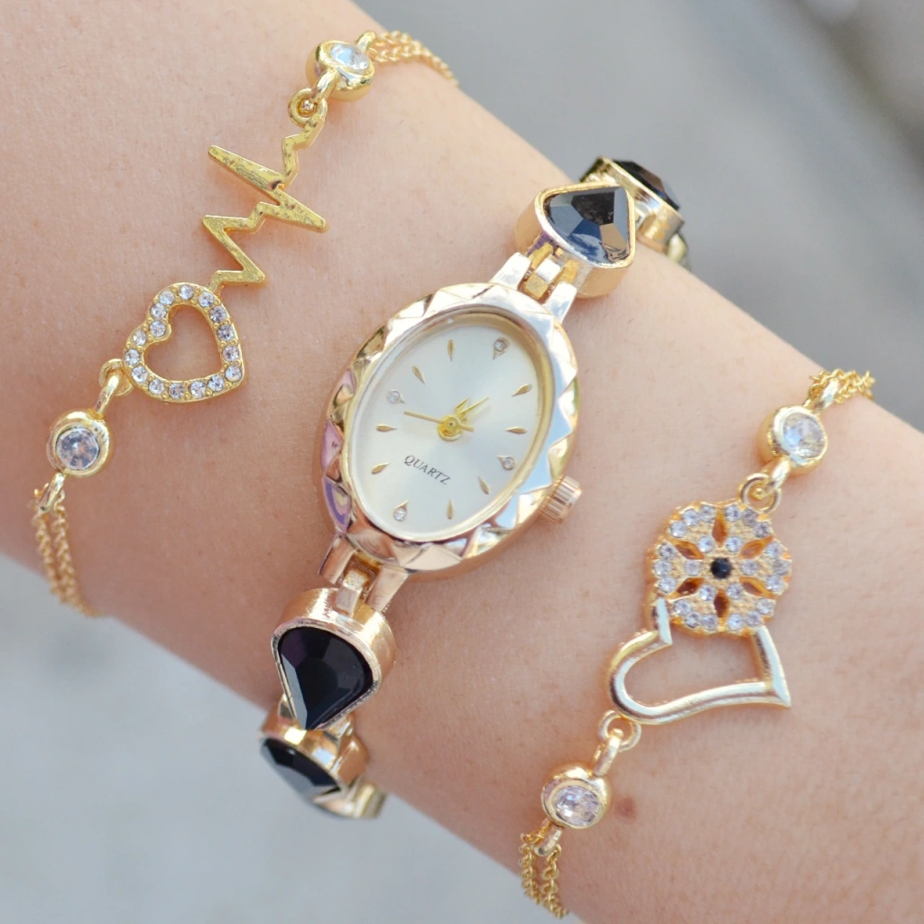 Gold Taşlı Metal Kordon Kadın Saat Kombini 3592