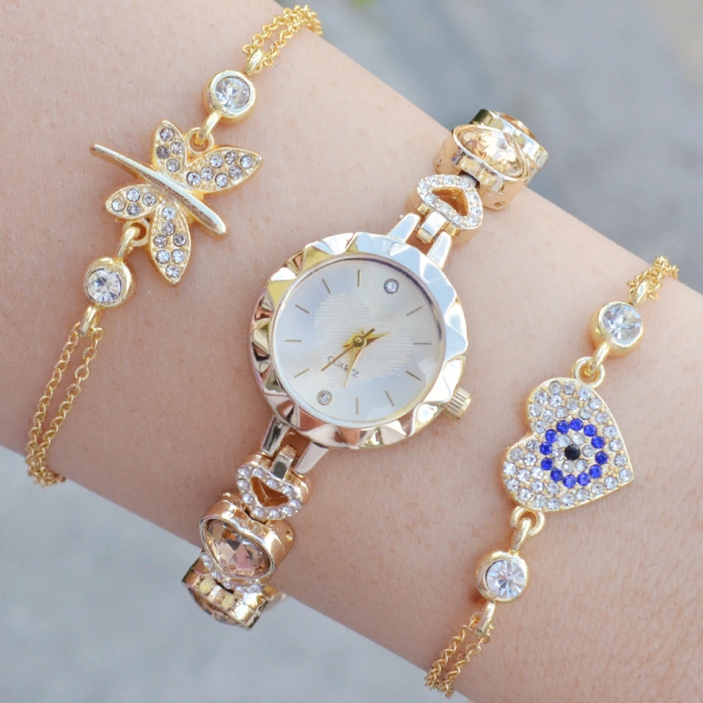 Gold Taşlı Metal Kordon Kadın Saat Kombini 3601