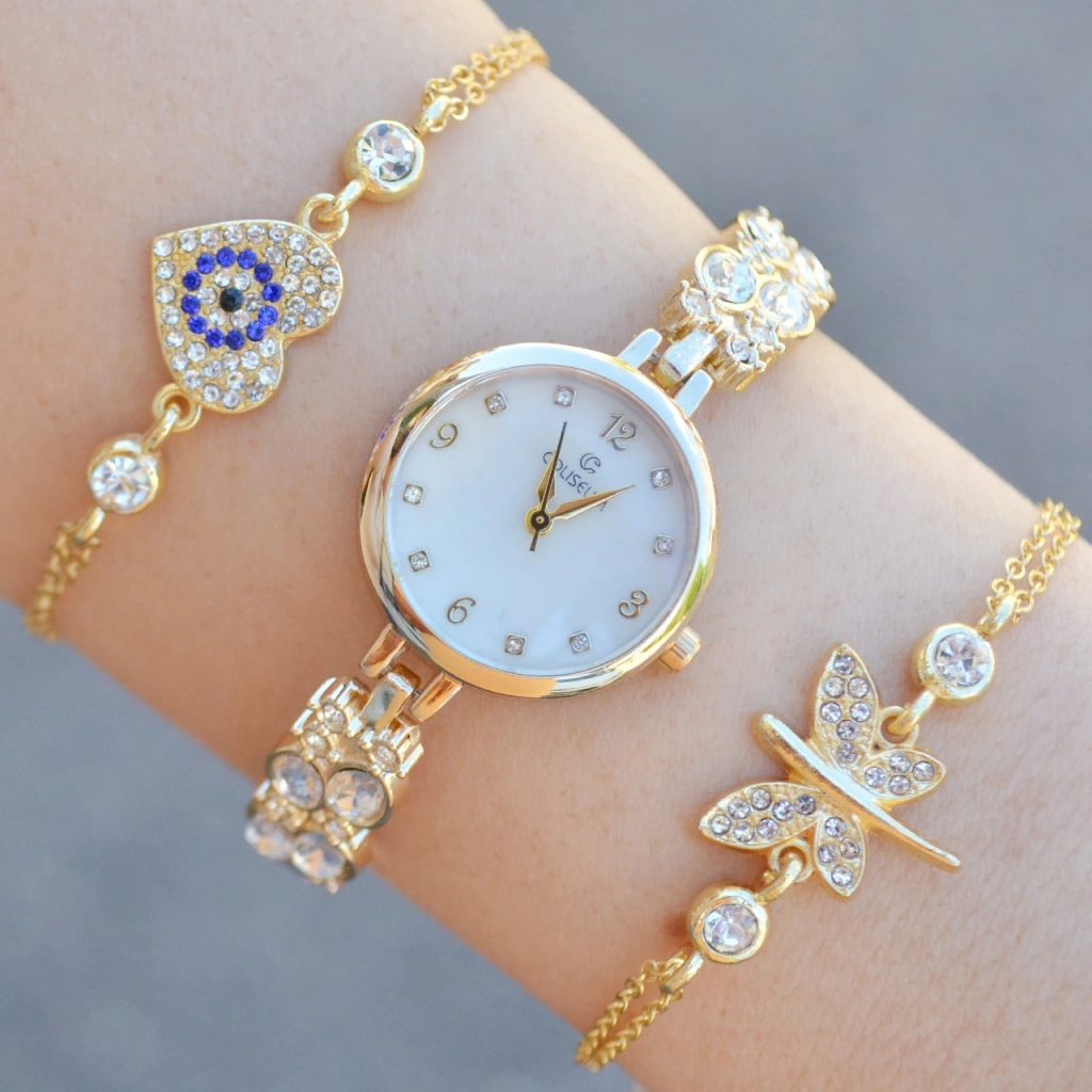 Gold Taşlı Metal Kordon Kadın Saat Kombini 3602