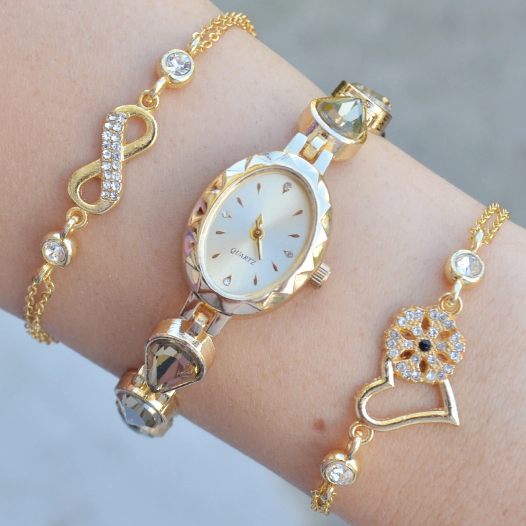 Gold Taşlı Metal Kordon Kadın Saat Kombini 3615