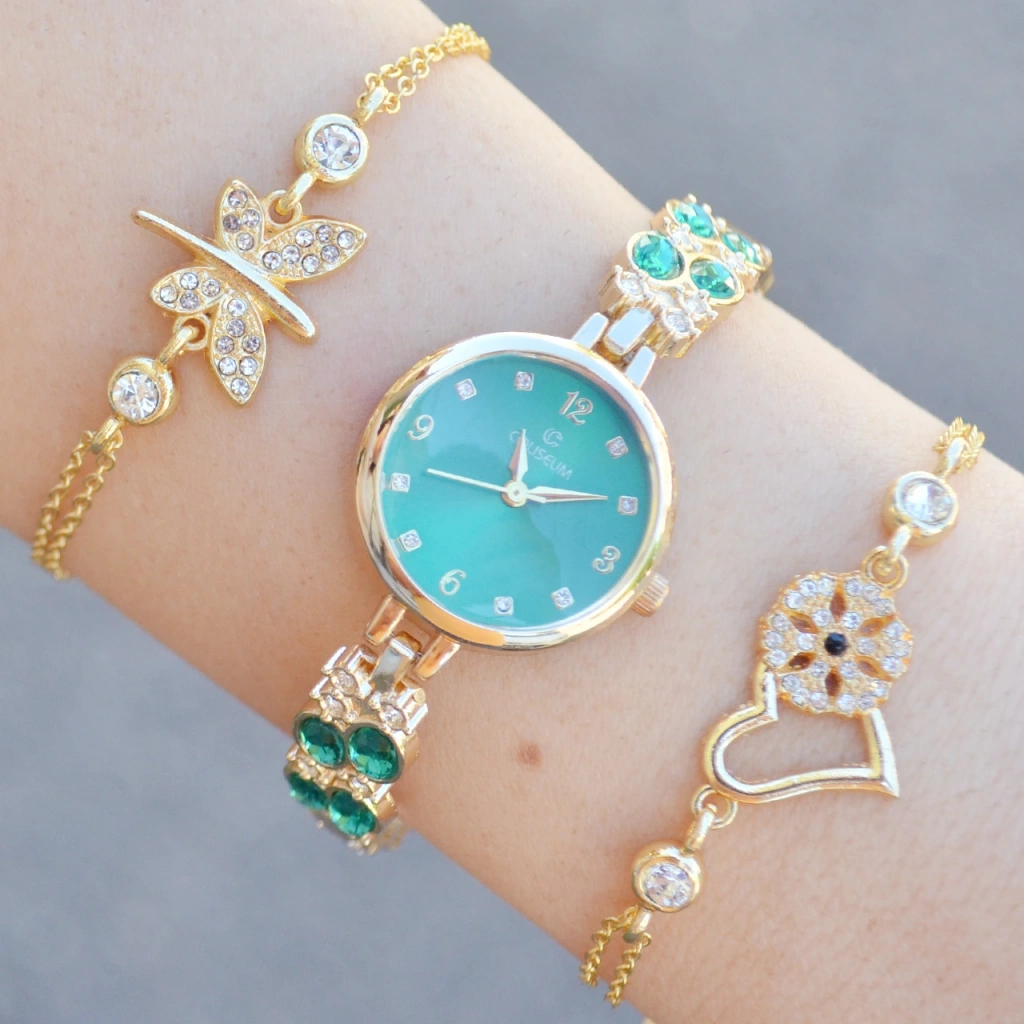 Gold Taşlı Metal Kordon Kadın Saat Kombini 3628