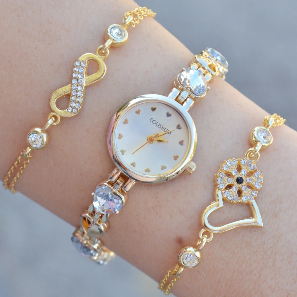 Gold Taşlı Metal Kordon Kadın Saat Kombini 3653