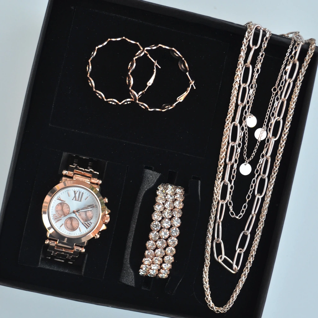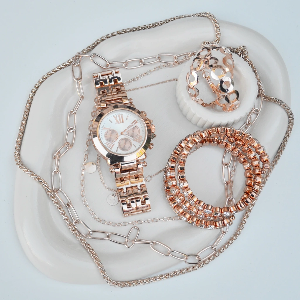 Rose Metal Kordon Küpe Kolye Bileklik Seti 3668