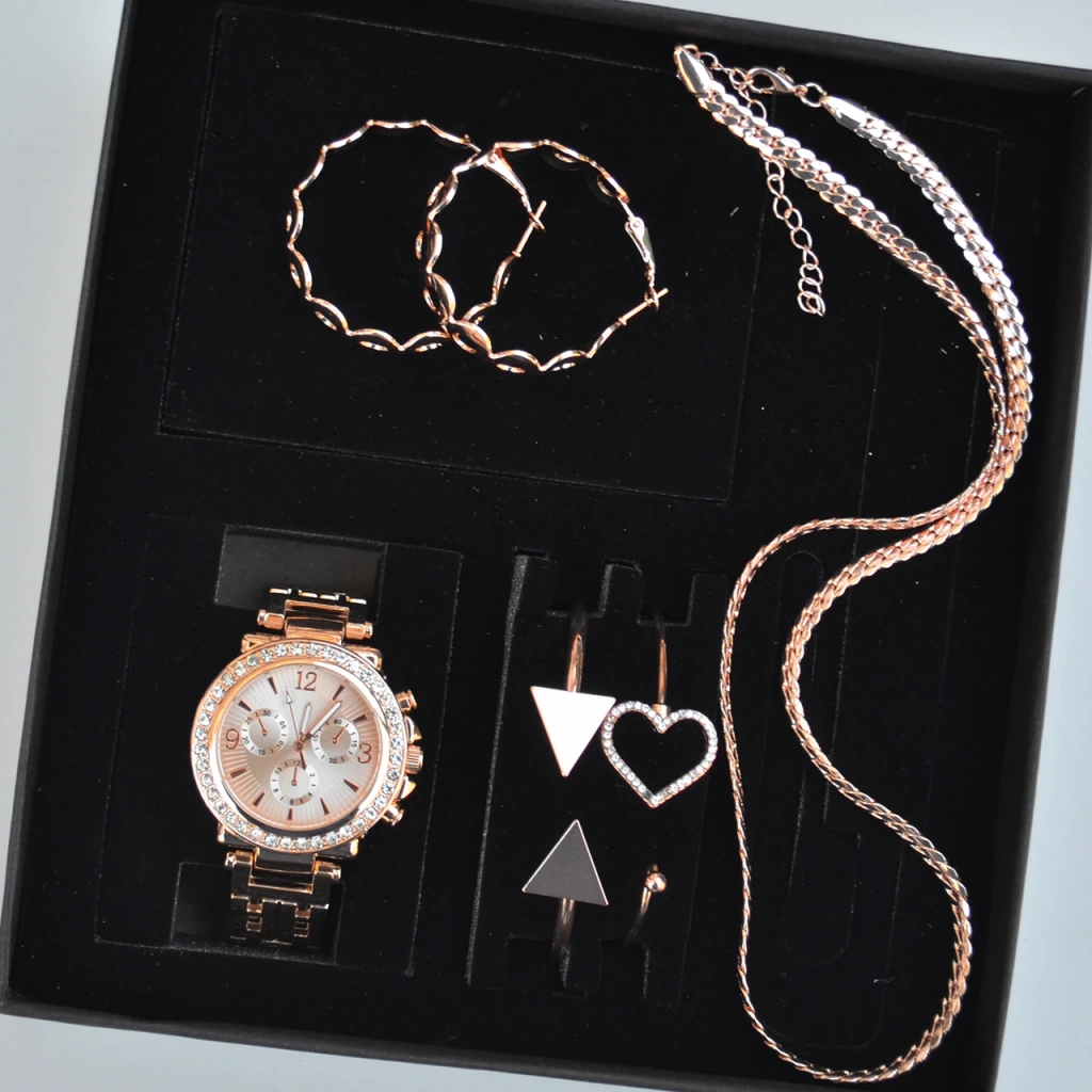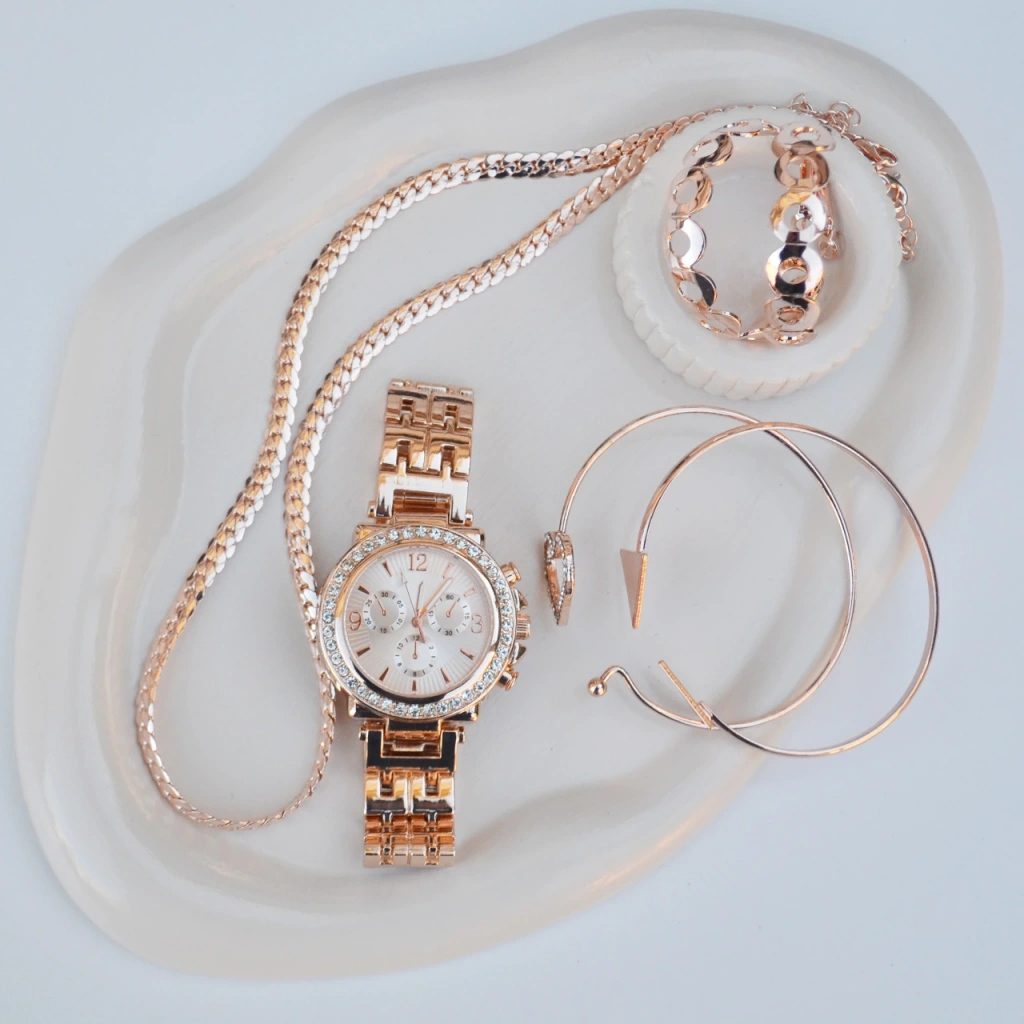 Rose Metal Kordon Küpe Kolye Bileklik Seti 3665