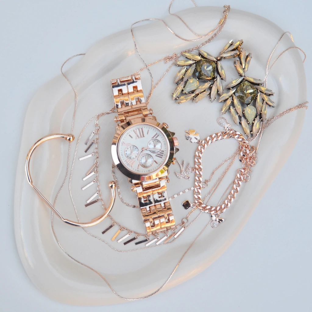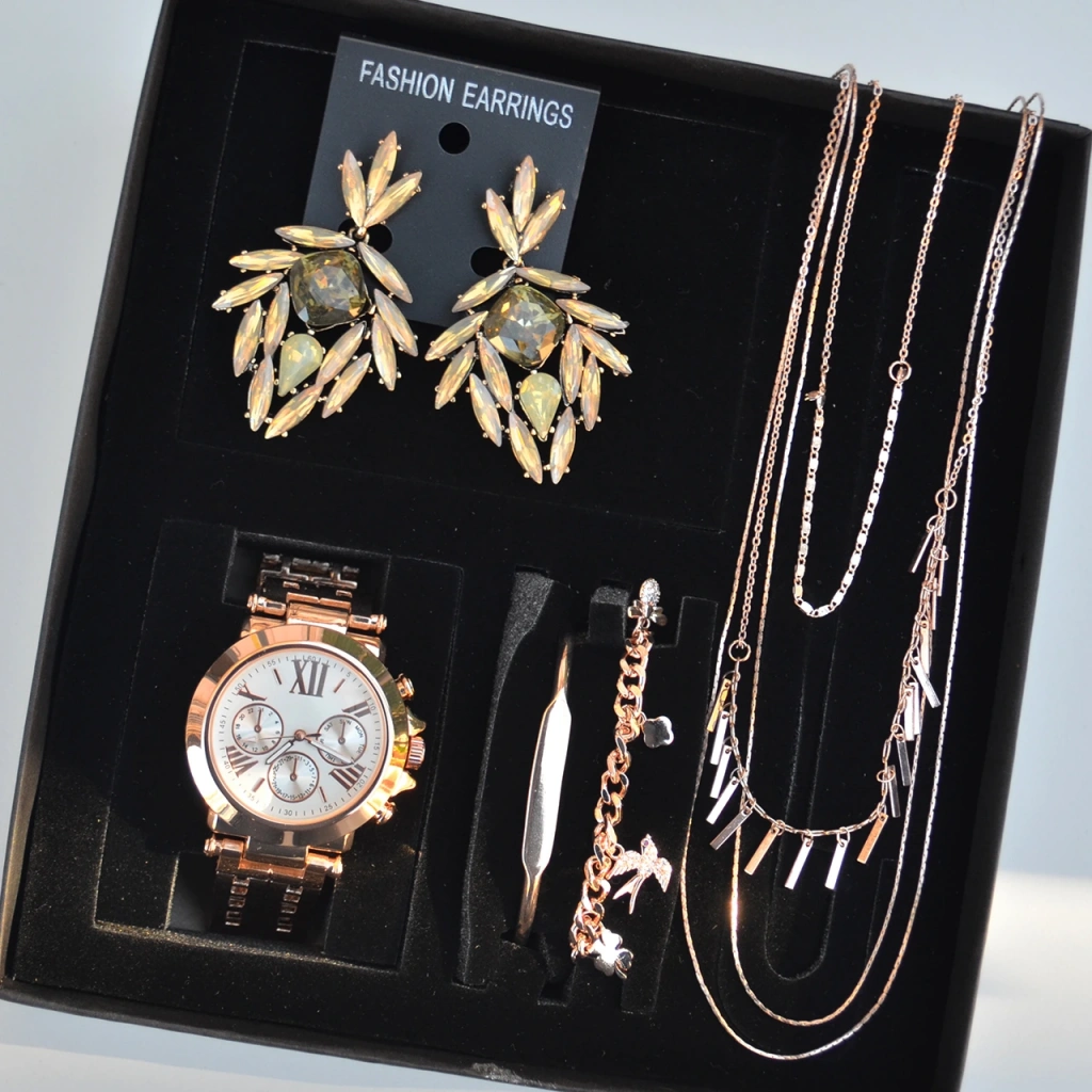 Rose Metal Kordon Küpe Kolye Bileklik Seti 3672