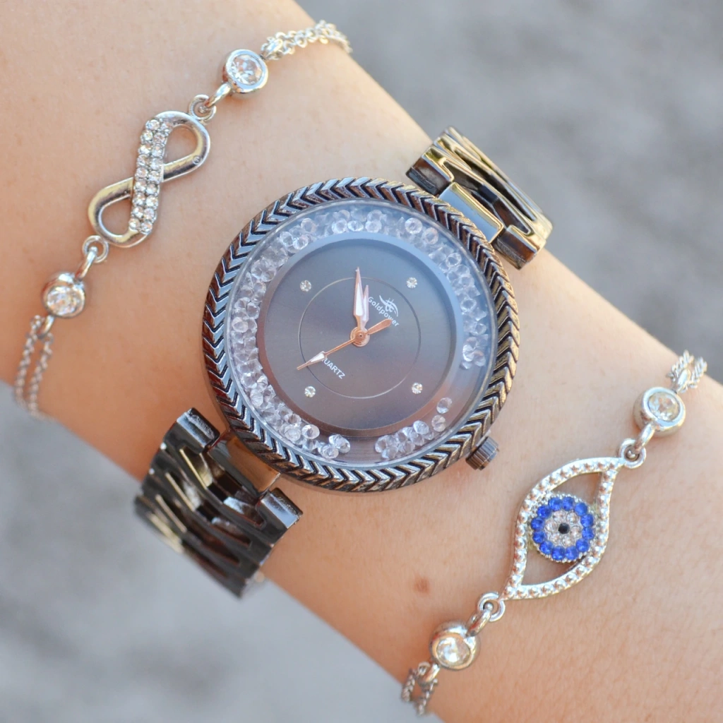 Taşlı Siyah Metal Kordon Kadın Saat Kombini 1078