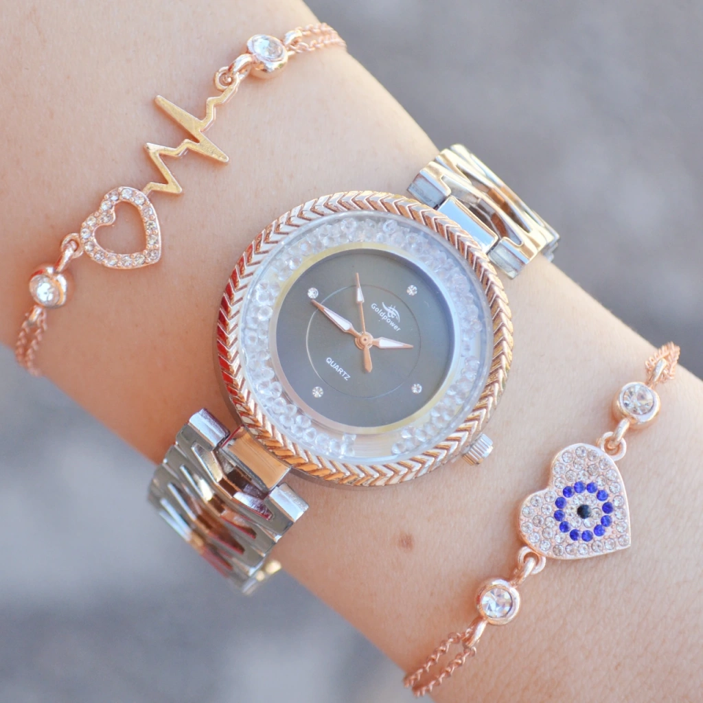 Taşlı Silver Rose Metal Kordon Bayan Saat Kombini