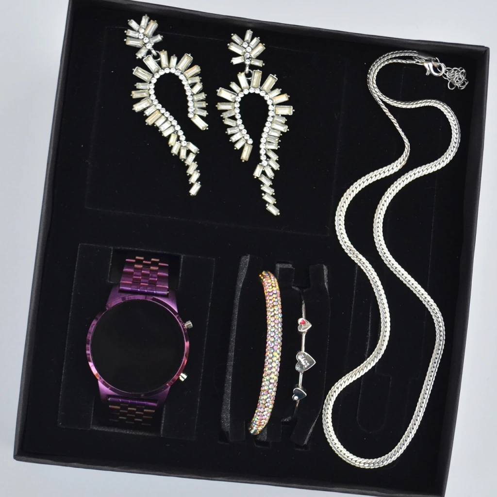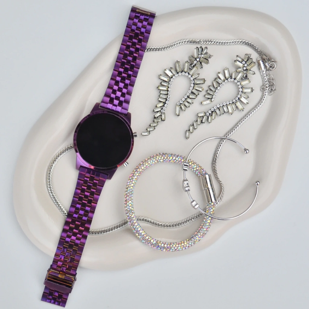 Saat, 2 adet bileklik, kolye, ve küpe olmak üzere set olarak gönderilmektedir.
