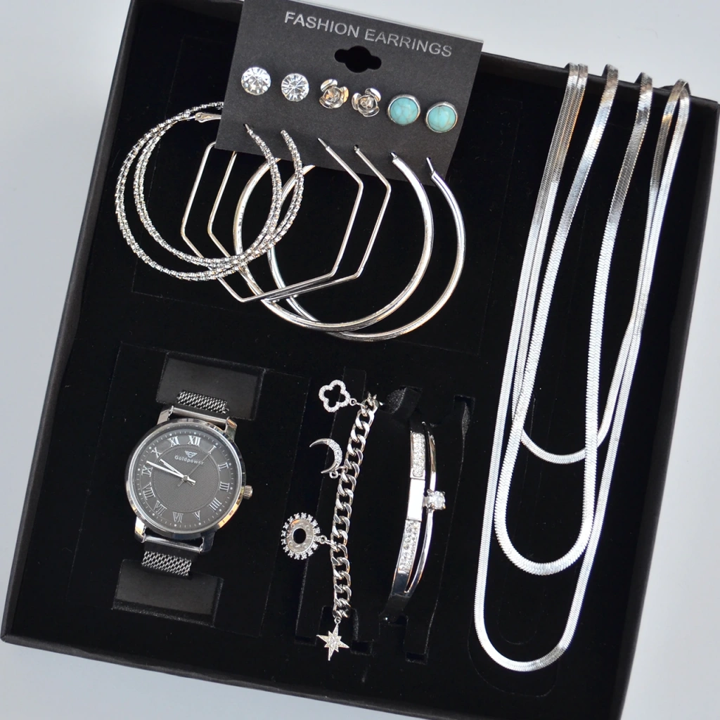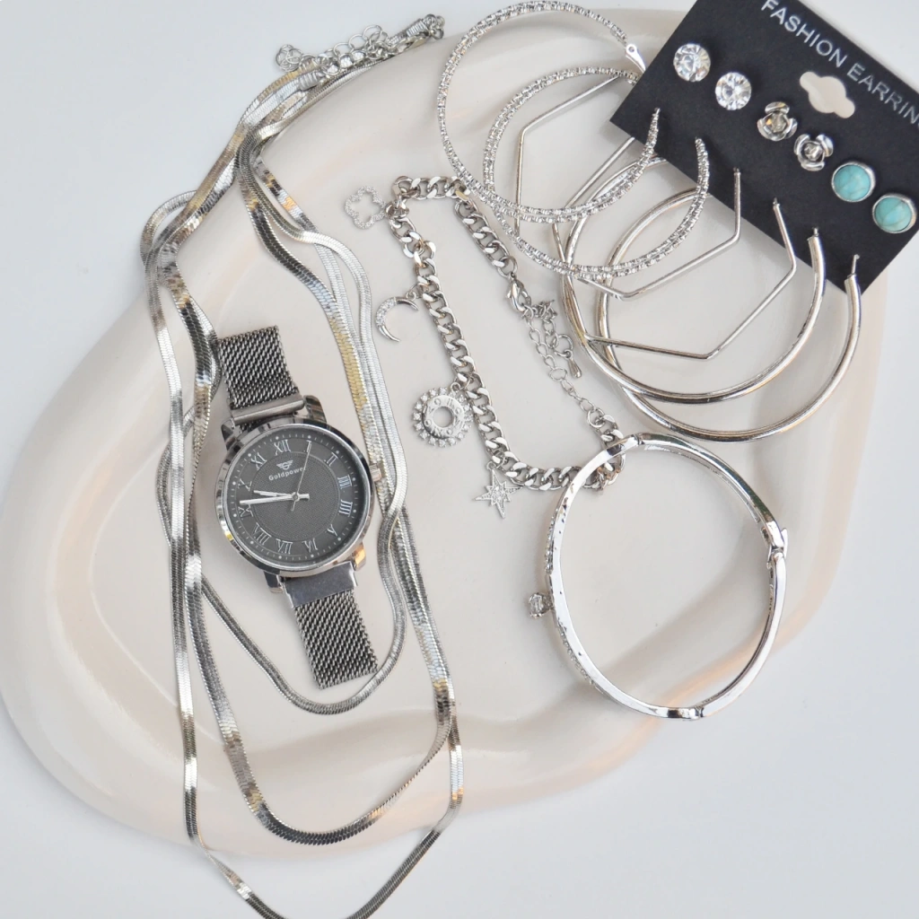 Saat, 2 adet bileklik, kolye, ve küpe olmak üzere set olarak gönderilmektedir.