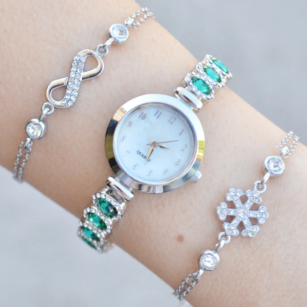 Yeşil Taşlı Silver Metal Kordon Kadın Saat Kombini