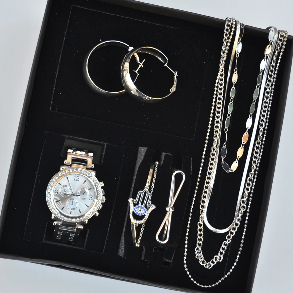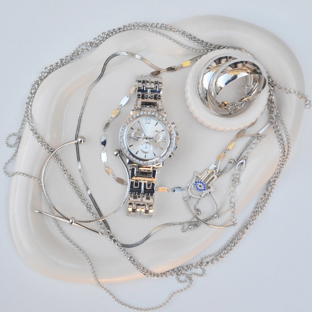 Silver Metal Kordon Küpe Kolye Bileklik Seti 3666