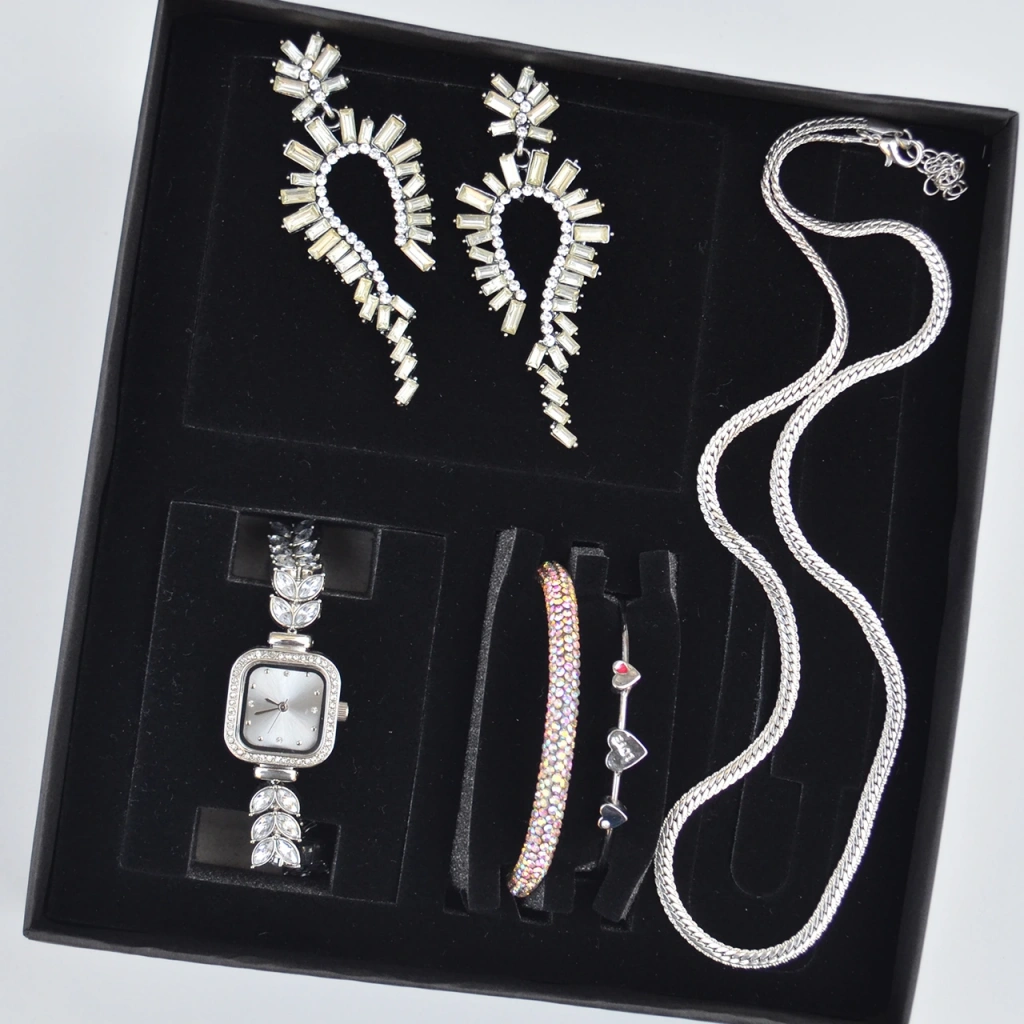 Saat, 2 adet bileklik, kolye, ve küpe olmak üzere set olarak gönderilmektedir.